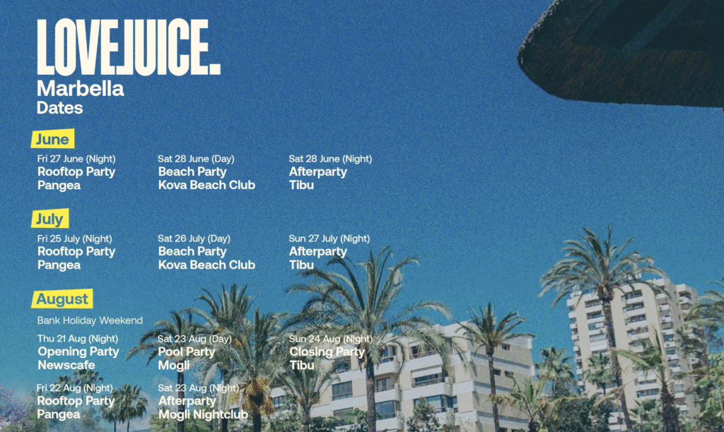 LoveJuice Marbella – Three parties, three iconic venues, one wild weekend 🎉 (July 25–27)